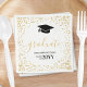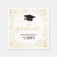 Ces élégantes serviettes en papier noir, blanc et or de la fête de graduation ont le mot "gradué" dans la police de script de calligraphie moderne, avec le nom du diplômé et la classe de l'année, et un casquette de grade au sommet. Il y a un cadre de confettis de parties scintillant en faux or autour du bord.