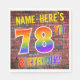 L'avant de ce design passionnant, vibrant et attrayant d'anniversaire sur le thème de l'anniversaire, est doté d'un nom personnalisé, et le message "78E ANNIVERSAIRE !" avec des lettres ayant un motif multicolore inspiré du spectre arc-en-ciel, sur un arrière - plan motif inspiré de murs de briques. L'aspect est inspiré de celui des graffitis ou de l'art de rue dessinés sur un mur. Des serviettes en papier amusantes comme celle-ci pourraient être utilisées lors d’une fête d’anniversaire pour célébrer le soixante-dix-huitième anniversaire de quelqu’un. [~Z0000367]