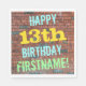 Cette conception amusante de serviette en papier sur le thème de l'anniversaire comporte un message comme "HAPPY 13th BIRTHDAY, FIRSTNAME!", où le nom peut être personnalisé. L'arrière - plan est représenté par un mur en brique composé de briques de couleur rougeâtre. Le texte du message personnalisable comporte des couleurs comme le bleu, le jaune et le vert, et il a un aspect inspiré de celui des graffitis peints. Des serviettes comme celles-ci pourraient être utilisées à une fête d'anniversaire pour quelqu'un qui célèbre son treizième anniversaire. [~Z0000271]