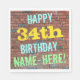 Cette conception amusante de serviette en papier sur le thème de l'anniversaire comporte un message comme "HAPPY 34th BIRTHDAY, NAME-HERE !", où le nom peut être personnalisé. L'arrière - plan est représenté par un mur en brique composé de briques de couleur rougeâtre. Le texte du message personnalisable comporte des couleurs comme le bleu, le jaune et le vert, et il a un aspect inspiré de celui des graffitis peints. Des serviettes comme celles-ci pourraient être utilisées à une fête d'anniversaire pour quelqu'un qui célèbre son trente-quatrième anniversaire. [~Z0000271]