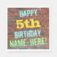 Cette conception amusante de serviette en papier sur le thème de l'anniversaire comporte un message comme "HAPPY 5th BIRTHDAY, NAME-HERE!", où le nom peut être personnalisé. L'arrière - plan est représenté par un mur en brique composé de briques de couleur rougeâtre. Le texte du message personnalisable comporte des couleurs comme le bleu, le jaune et le vert, et il a un aspect inspiré de celui des graffitis peints. Des serviettes comme celles-ci pourraient être utilisées à une fête d'anniversaire pour quelqu'un qui célèbre son cinquième anniversaire. [~Z0000271]