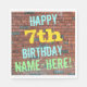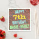 Cette conception amusante de serviette en papier sur le thème de l'anniversaire comporte un message comme "HAPPY 7th BIRTHDAY, NAME-HERE!", où le nom peut être personnalisé. L'arrière - plan est représenté par un mur en brique composé de briques de couleur rougeâtre. Le texte du message personnalisable comporte des couleurs comme le bleu, le jaune et le vert, et il a un aspect inspiré de celui des graffitis peints. Des serviettes comme celles-ci pourraient être utilisées à une fête d'anniversaire pour quelqu'un qui célèbre son septième anniversaire. [~Z0000271]