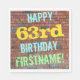 Cette conception amusante de serviette en papier sur le thème de l'anniversaire comporte un message comme "HAPPY 63rd BIRTHDAY, FIRSTNAME!", où le nom peut être personnalisé. L'arrière - plan est représenté par un mur en brique composé de briques de couleur rougeâtre. Le texte du message personnalisable comporte des couleurs comme le bleu, le jaune et le vert, et il a un aspect inspiré de celui des graffitis peints. Des serviettes comme celles-ci pourraient être utilisées à une fête d'anniversaire pour quelqu'un qui célèbre son soixante-troisième anniversaire. [~Z0000271]