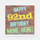 Cette conception amusante de serviette en papier sur le thème de l'anniversaire comporte un message comme "HAPPY 92nd BIRTHDAY, NAME-HERE !", où le nom peut être personnalisé. L'arrière - plan est représenté par un mur en brique composé de briques de couleur rougeâtre. Le texte du message personnalisable comporte des couleurs comme le bleu, le jaune et le vert, et il a un aspect inspiré de celui des graffitis peints. Des serviettes comme celles-ci pourraient peut-être être utilisées à une fête d'anniversaire pour quelqu'un qui célèbre son quatre-vingt-dix-deuxième anniversaire. [~Z0000271]