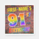 L'avant de ce design passionnant, accrocheur et amusant de serviette en papier sur le thème de l'anniversaire est doté d'un nom personnalisé, et le message "91E ANNIVERSAIRE !" avec des lettres ayant un motif multicolore inspiré du spectre arc-en-ciel, sur un arrière - plan motif inspiré par un mur de briques. Le style s'inspire de celui du street art ou graffiti dessiné sur un mur. Des serviettes en papier amusantes comme celle-ci pourraient être utilisées lors d’une fête d’anniversaire en l’honneur du quatre-vingt-dix-unième anniversaire de quelqu’un. [~Z0000367]