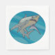 Un grand requin blanc dans l’eau montre ses dents. Ce design semble vraiment efficace sur ces serviettes en papier