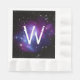 Monogramme blanc à une seule lettre contre image spatiale de la grappe de galaxies bleues et violettes MACS J0717 grâce au programme NASA et Hubble.