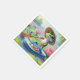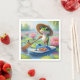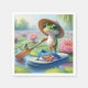 Une grenouille géante se dresse sur une rampe de sable avec un écorce et un papillon entourés de nénuphars roses
