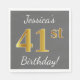 Ce design simple de serviette en papier présente un message comme "41e anniversaire de Jessica !", avec le "41e" à l’apparence fausse/imitation or, sur un arrière - plan gris (gris). Le nom peut être personnalisé. Il pourrait être utilisé à une fête d'anniversaire pour quelqu'un qui célèbre son quarante et unième anniversaire. [~Z0000190]