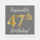 Ce design simple de serviette en papier présente un message comme "47e anniversaire de Reginald!", avec le "47e" ayant un aspect faux/imitation or, sur un arrière - plan gris (gris) coloré. Le nom peut être customisé. Il pourrait être utilisé à une fête d'anniversaire pour quelqu'un qui célèbre son quarante-septième anniversaire. [~Z0000190]