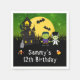 Cette assiette amusante et éffrayante présente de mignons monstres Frankenstein à côté d'une maison hantée. Dans l'arrière - plan est une pleine lune avec des chauves-souris et un ciel de nuit vert avec des étoiles. C'est parfait pour une fête d'anniversaire à thème Halloween.