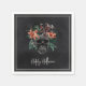 Un design éffrayant et chic d'Halloween, avec une illustration d'un crâne tropical fleuri surmonté de fleurs d'île orange et bordeaux et de feuillage de jungle verte sur un arrière - plan noir fumé. Personnalisez cette serviette en papier Halloween unique et élégante avec du texte personnalisé ; illustré par "Happy Halloween".