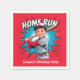 Illustration d'une bande dessinée de pop art montrant un jeune joueur de baseball capturé à mi-parcours. Le garçon porte un uniforme gris croustillant, avec des rayures rouges audacieuses, ses cheveux bruns de style soigné, regardant d'un casquette blanc éclatant, alors qu'il rayonne un sourire chaleureux et authentique. Il est positionné dynamiquement sur un fond de points de demi-ton classiques, de formes géométriques stylisées en couleurs primaires, et le texte "HOME RUN" emblazonné dans une police comique rétro au-dessus de sa tête. Un paysage urbain stylisé avec un ciel jaune vif et une perspective exagérée forme le décor énergétique, éclairé par une lumière douce et diffuse qui met en valeur l’énergie et l’action ludique de la scène.