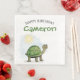 Ces serviettes de fête personnalisées ont une jolie illustration de tortue. Une petite tortue verte est placée en bas à gauche, avec un soleil qui la surplombe. C'est bon pour une douche ou une fête d'anniversaire pour enfant. Un exemple de message "Joyeux anniversaire" est imprimé en haut, suivi d'un nom d'exemple. Vous pouvez personnaliser les serviettes pour inclure votre propre nom ou message personnalisé de votre choix.