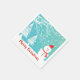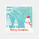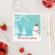Charmant bonhomme de neige avec foulard rouge et flocons de neige casquettes et abstraits, arbres enneigés. Joyeux dessin de Noël. Modèle de serviettes en papier personnalisable