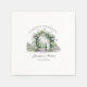 Ce design de mariage romantique à la serviette en papier présente une arche mariage fleurie et une fontaine avec une typographie grise personnalisable sur un arrière - plan blanc.