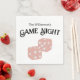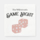 Ces serviettes personnalisées de fête ont un thème de Game Night. Une image de jeu de dés est imprimée au centre dans une parties scintillant rose. L'expression "Game Night" est imprimée au-dessus des dés avec un exemple de nom de famille. Vous pouvez personnaliser les serviettes pour inclure votre propre nom ou texte personnalisé.