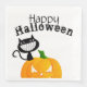 Ces drôles de serviettes d'Halloween pour les enfants présentent un chat noir stupide et souriant assis sur le dessus d'un citrouille à lanterne de jack orange vif. Le texte dit "Happy Halloween" en lettres affligées.