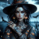 Plaques en papier de fête d'Halloween avec art de l'ai représentant une sorcière gothique avec tatouages, boucles d'oreilles citrouilles et chauves-souris.
