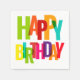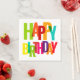 Une serviette d'anniversaire vibrante avec des lettres audacieuses et multicolores, avec l'orthographe "Joyeux anniversaire". Le Napkin est placé sur une surface en marbre, entouré de fraises fraîches et d'un verre de boisson rouge.