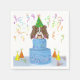 Des serviettes de fête pour une fête anniversaire de enfant avec le Cavalier King Charles Spaniel surgissant d'un gâteau. Art numérique créé par Daphsam Photography.