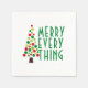 Le design de vacances de style moderne et minimaliste comprend un sapin de Noël avec des ornements de boules rouges et vertes, un texte vert "Merry Every Thing" et un arrière - plan blanc.