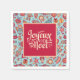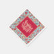 Une police tourbillonnante de calligraphie élégante et soignée en beige sur rouge dit "Joyeux Noel" qui est français pour Joyeux Noël. Le lettrage est entouré d'une forme rouge carré autour de laquelle les figurines du Père Noël; un biscuit pour pain d'épice pirate; un biscuit; des cadeaux emballés; des baubels; des étoiles; des montres de poche et des flocons de neige apparaissent en rouge muet; de la moutarde et du bleu sur le bleu pâle. Ils sont idéaux pour votre prochain pique-nique ou dans le cadre de votre table pour cette saison festive.