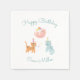 Illustration adorable et colorée de trois petits chats accueillant une fête d'anniversaire avec des glaces et des casquettes de fête.
