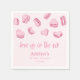Douce et romantique Valentine thème napperie de papier de douche nuptiale avec illustration de macarons en forme de coeur rose. Le texte dit "l'amour est dans l'air."