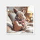 Un mignon lapin aux grands yeux expressifs porte un chocolat en forme de coeur inscrit "I Love You" sur un lit pour la Saint-Valentin ou Pâques.