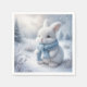 Un lapin blanc et moelleux portant une écharpe bleue se trouve dans un pays merveilleux d'hiver enneigé, entouré de plantes et d'arbres à feuillage persistant recouverts de gel. Peut être utilisé pour Noël.