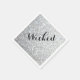 "Wicked" écrit dans un script de ruban fantaisie orne cette serviette brillante argentée, ce qui en fait un endroit parfait pour ajouter un peu de glamour à votre fête d'Halloween.