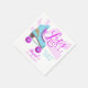 Une soirée d'anniversaire amusante en papier serviette pour une soirée à thème de patinage à rouleaux avec une ambiance vintage. Il y a une illustration dessinée à la main d'un patinage à rouleaux de couleurs rose et bleue avec une fausse parties scintillant d'or en forme de foudre imprimé dessus. Le texte dit : "Allons-y ! Accrochez vos patins pour fêter ça." Customisez ce produit en ajoutant le nom et l'âge de votre enfant.