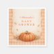 A warm and cozy fall baby shower design featuring a hand-painted watercolor pumpkin surrounded by soft peach florals, golden leaves, and delicate autumn accents. The earthy orange palette and elegant arch layout create a refined harvest aesthetic that feels timeless and inviting. Perfect for an autumn celebration, a neutral fall theme, or a charming “Little Pumpkin” baby shower with rustic floral details.