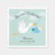 Livraison spéciale par une jolie cigogne blanche portant un bébé garçon dans un paquet bleu à travers le ciel, serviettes parfaites pour la douche bébé garçon. Invitations, assiettes et plus dans notre collection.