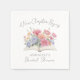 Une serviette en papier douce et élégante conçue pour une fête de mariage sur le thème du livre. Au centre de la serviette se trouve une illustration aquarelle d'un livre ouvert, rehaussée de fleurs délicates en rose blush, orange, jaune, violet et bleu, ainsi que de feuilles vertes douces pour une atmosphère romantique de livre de contes.