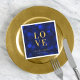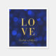 Serviette élégante présentant les mots "Amour" en faux feuillet d'or sur un fond à motif de lumières bokeh bleu saphir. Parfait pour les fêtes de fiançailles, les mariages et les anniversaires de mariage.