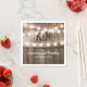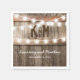 Serviettes mariages rustiques avec un arrière - plan de tonneau de chêne de la grange, des lampes à cordes tordues, votre monogramme, date mariage et vos noms.