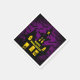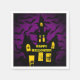 Des serviettes en papier pour Halloween avec l'image de chauves-souris contre un ciel violet et une maison hantée avec des araignées éffrayantes, des chats et d'autres surprises effrayantes.
