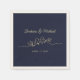 Elégant minimaliste moderne, serviettes de mariage bleu marine personnalisées avec des inséparables de couple dessinés à la main et script de calligraphie manuscrit.