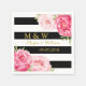 Serviettes mariages Monogrammes à rayures noir et blanc avec aquarelle rose fleurs vintages et texte couleur or. Customisez ces serviettes avec vos noms, monogramme et date mariage.