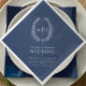 Feuille de courge ovale en blanc sur des serviettes mariages bleu marine. Ajoutez les initiales monogrammes, le nom et la date mariage de votre couple dans un blanc classique sur bleu marine foncé. Autres couleurs et articles mariages correspondants disponibles. © Dessin et dessin de la feuille d'origine par Sarah Trett pour www.mylittleedenweddings.com sur Zazzle.
