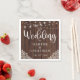 Rustic Wood String Lights Mariage dentelle table et Cocktail Napkins, avec un arrière - plan en bois rustique avec des cordes scintillantes de lumières et de la dentelle de style vintage dans les coins inférieurs. Ajoutez vos détails personnalisés pour un look rustique et chic ! Veuillez nous contacter à cedarandstring@gmail.com si vous avez besoin d'aide pour la conception ou les produits correspondants.
