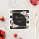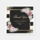 Élégantes serviettes en papier mariage rayé noir et blanc avec fleurs de pêche et rose vif et verdure encadrant les détails mariages à l'intérieur d'un cadre doré contre un arrière - plan noir et blanc orné de confettis dorés. Éléments correspondants disponibles.