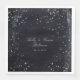 Une serviette de mariage sophistiquée en noir et argent qui correspond à la plaque de papier du dîner avec un lavage d'aquarelle noir avec des étoiles brillantes en argent et vos noms dans une calligraphie classique anglaise.