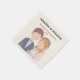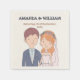 Ces serviettes en papier mariage sont une charmante illustration d'une mariée et d'un marié. Le marié est représenté avec des cheveux bruns courts, un teint clair, et porte une veste de costume bleu marine sur une chemise bleu clair et une cravate blanche. Il a une petite boutonnière épinglée sur son revers. La mariée se tient à côté de lui, souriant doucement. Elle a des cheveux ondulés, rougeâtre-oranges, ornés d'une couronne de fleurs rose, orange et blanche. Un délicat voile blanc coule derrière elle. Elle porte une robe mariage blanche avec un collier d'amoureux et un collier de perles. Cette illustration simple, en forme de dessin animé, suggère un lien amoureux des cordes entre eux. C'est fantaisiste et attachant, donnant un ton joyeux au prochain mariage.