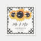 Des serviettes en papier mariage de tournesol et de en vichy noir et blanc personnalisées avec des tournesols sur un arrière - plan en vichy orné de lampes à cordes. Éléments correspondants disponibles.