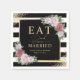 Élégantes serviettes en papier mariage rayé noir et blanc avec fleurs roses rousses. Éléments correspondants disponibles.