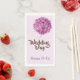 Papier de jour de mariage serviettes d'hôtes avec fleur hydrangée flottante. Rose avec les noms du couple chanceux. Design floral romantique simple.