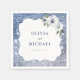 Cadre pailleté argenté et bleu avec fleurs en bleu poussiéreux et blanc, élégant et stylé, superbes serviettes de mariage personnalisées.
